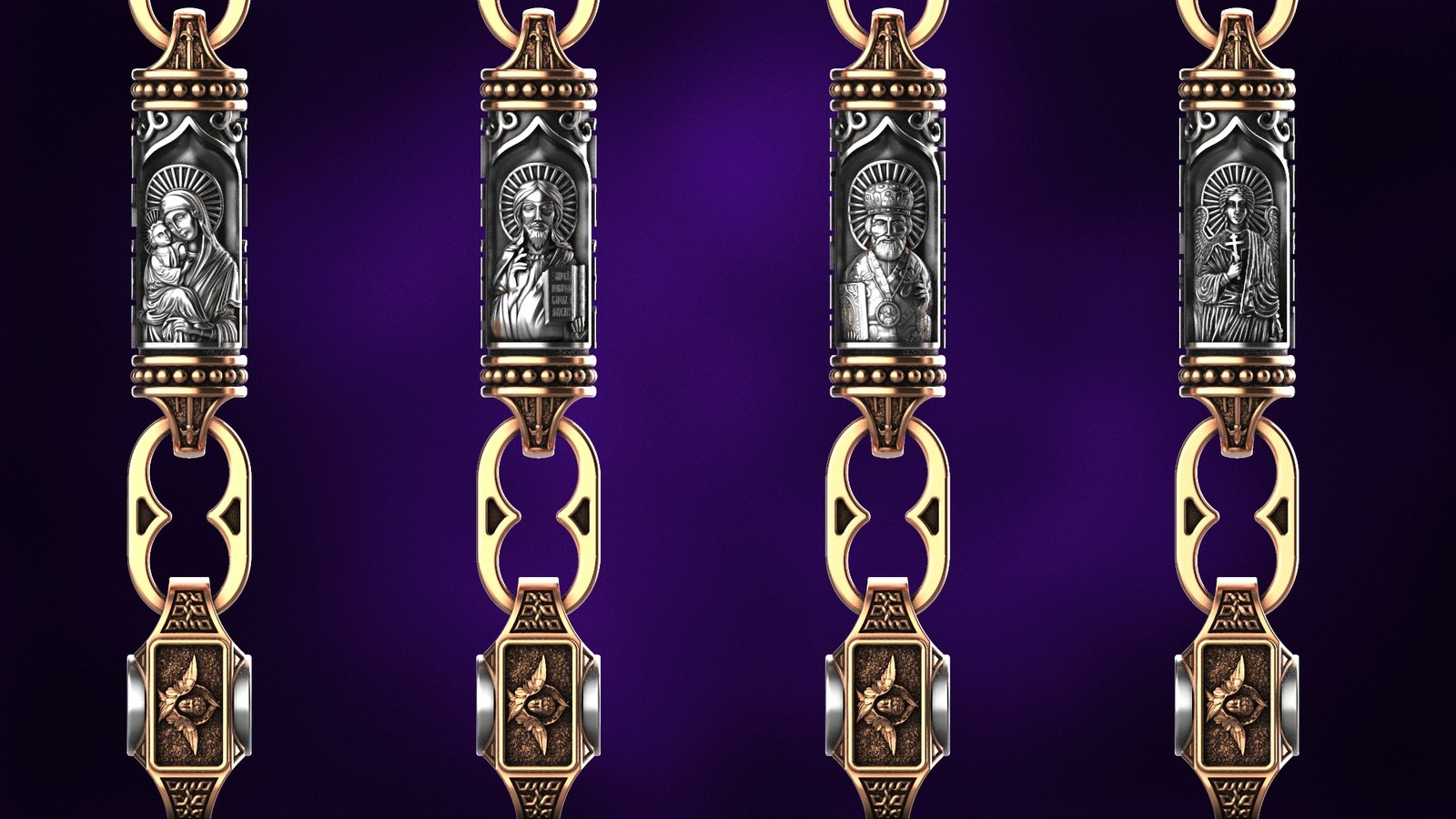 Ланцюжок із релігійними вставками та знаком зодіаку створений для тих, хто цінує символіку й деталі. Контраст фактур, чіткість рельєфу та продумана композиція роблять його не просто аксесуаром, а особистим оберегом. Можлива персоналізація: вибір святих, знаку зодіаку та гравіювання.