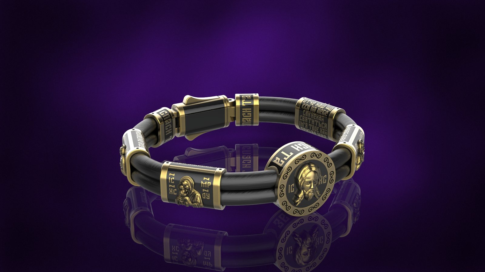 Чоловічий браслет із чорного каучуку з позолоченими елементами, молитвами та іконами. Стильна і міцна модель, підходить для щоденного носіння та подарунків.